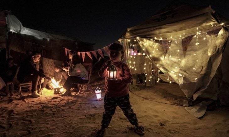 في داخل خيمتهم البدائية، قامت عائلة فلسطينية بتعليق أحبال إضاءة وفوانيس شهر رمضان، الذي بات على الأبواب، تعبيرًا عن التفاؤل بهذا الشهر المبارك الذي ينتظره المسلمون مطلع الأسبوع الحالي.