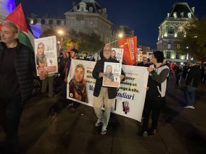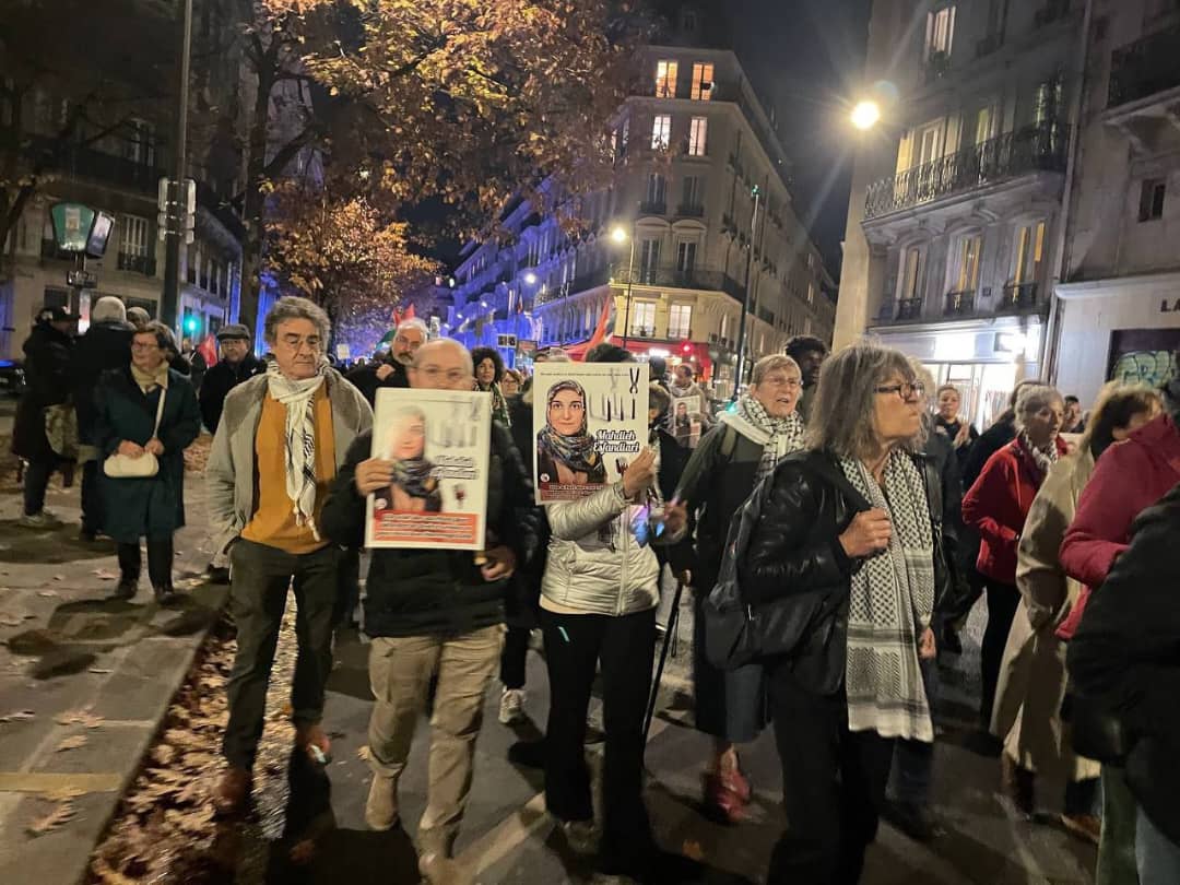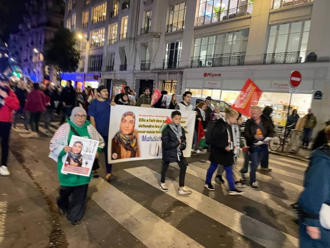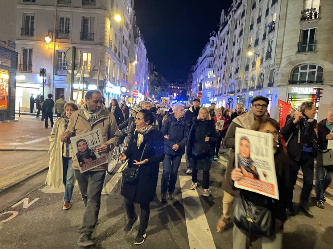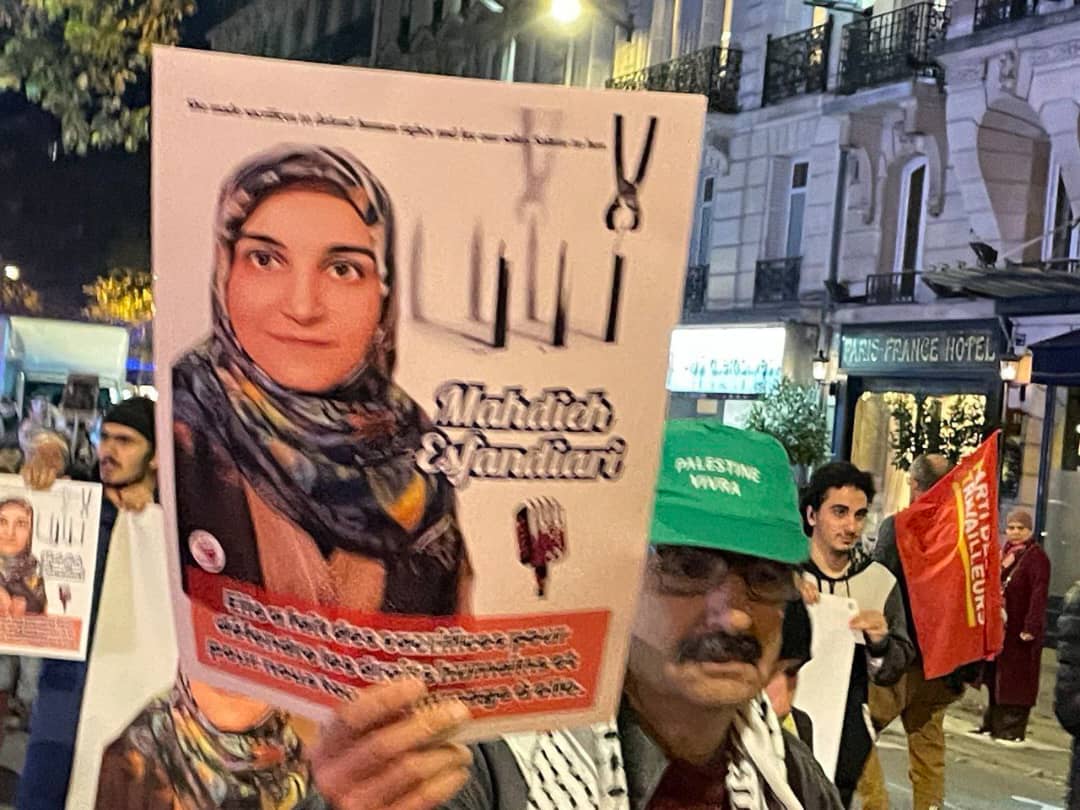 وحمل المتظاهرون صورًا للناشطة الإيرانية مهدية اسفندياري، التي اعتقلتها الحكومة الفرنسية وجرى إصدار حكم بالإفراج عنها بشروط.