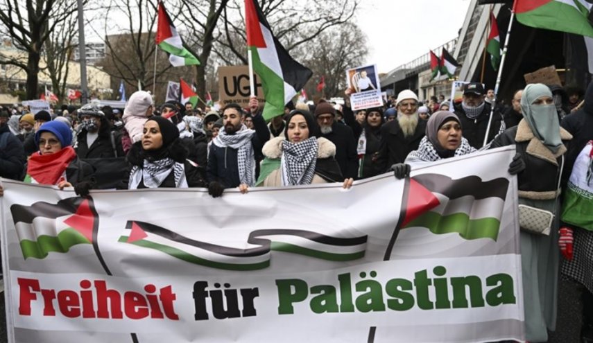 ورفع مئات الأشخاص المتظاهرون الأعلام الفلسطينية ولافتات منددة بالعدوان، مكتوب عليها: “أوقفوا الإبادة”، “لا أسلحة لإسرائيل”، و”ألمانيا تلطخ يديها بدماء الفلسطينيين”، كما رددوا هتافات ضد الاحتلال.