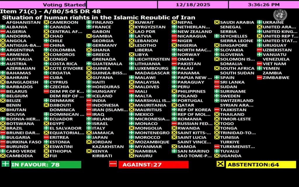 وتم إقرار هذا القرار المناهض لإيران في جلسة الجمعية العامة للأمم المتحدة مساء الخميس بالتوقيت المحلي بـ 78 صوتاً فقط، وكان عدد الأصوات المؤيدة أقل من العام الماضي.