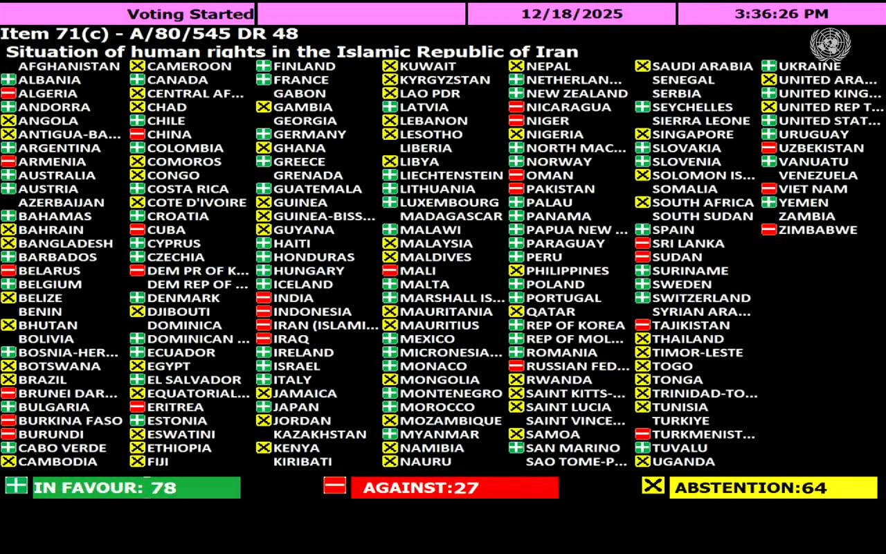 قرار كندا المناهض لإيران في الأمم المتحدة: الأصوات المعارضة والممتنعة فاقت الأصوات المؤيدة