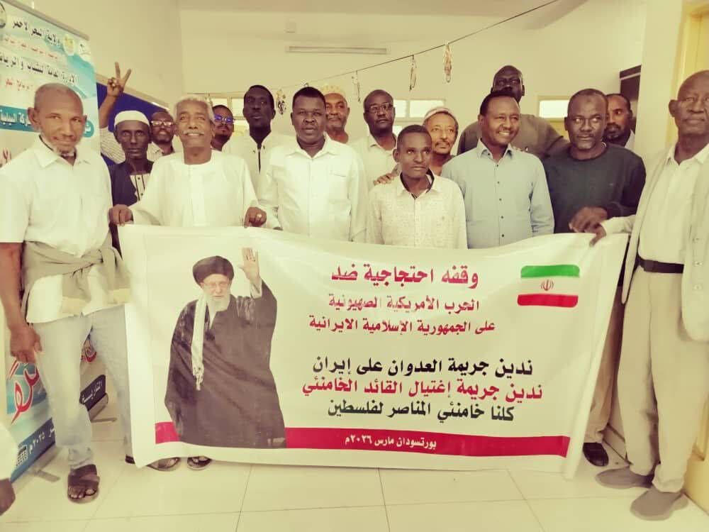 ادان مواطنون سودانيون بمدينة بورتسودان في حاضرة جمهورية السودان المؤقته، "العدوان الغاشم الذي شنته الولايات المتحدة الأمريكية بايعاز من الكيان الصهيوني على الجمهورية الإسلامية الايرانيه والذي أدى لاستشهاد الإمام السيد آيه الله الخامنئي".