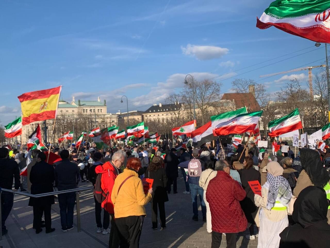 وتجمّع المشاركون في الساحة المركزية «شتوك إيم آيزن» قبل أن ينطلقوا في مسيرة نحو مبنى البرلمان؛ رافعين لافتات وشعارات مناهضة للحرب، معبّرين في هتافاتهم عن تضامنهم مع شعبي إيران وفلسطين.
