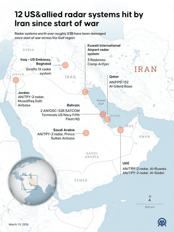 تظهر احدث صور الاقمار الصناعية ان 12 منظومة رادار اميركية قد اصيبت في 7 دول بالمنطقة منذ بدء الحرب الاخيرة.