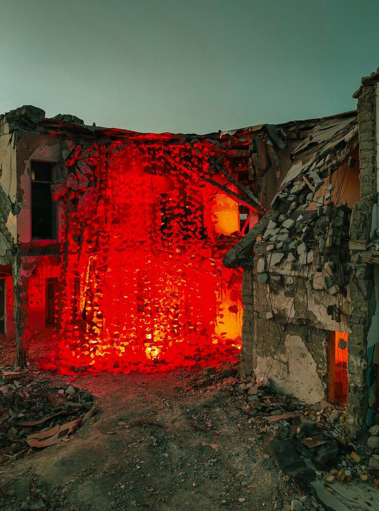 صُممت الفراشات الحمراء كناية عن أرواح الشهداء الصاعدة نحو السماء، مع الحفاظ على خفة التصميم وإمكانية تفكيكه لاحقاً لإعادة بناء المدرسة وتحويلها إلى متحف.